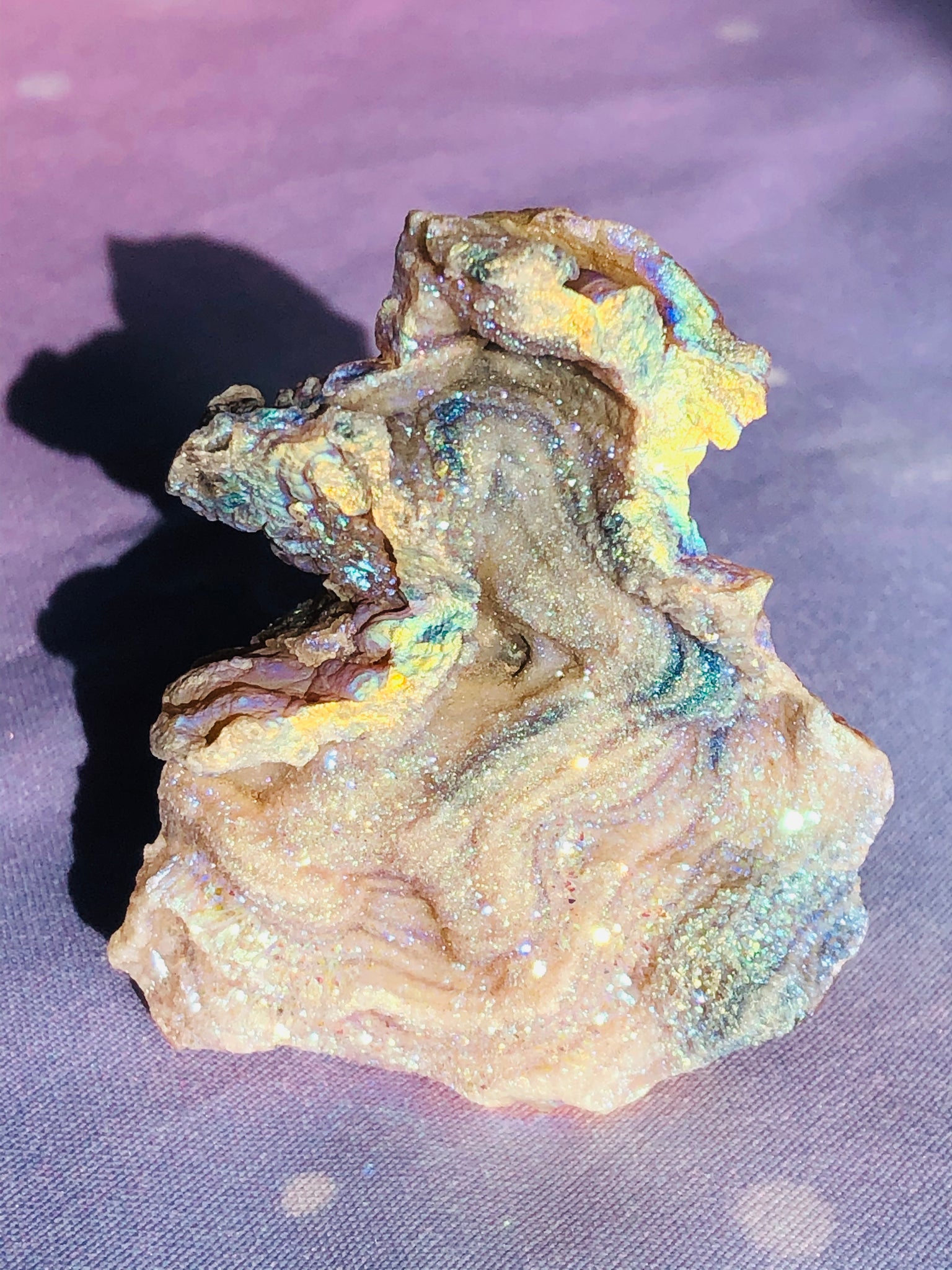 Raw mined chalcedony mineral coated and heated to create extreme shimmer.