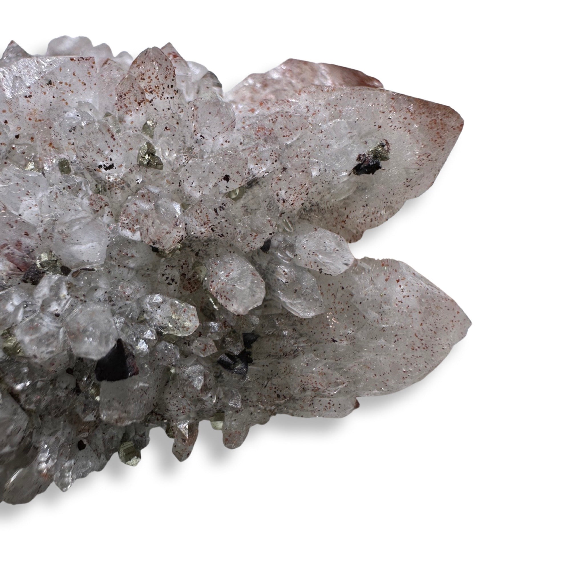 Aesthetic, etched quartz and calcite cluster, coated in sparkling golden pyrite.