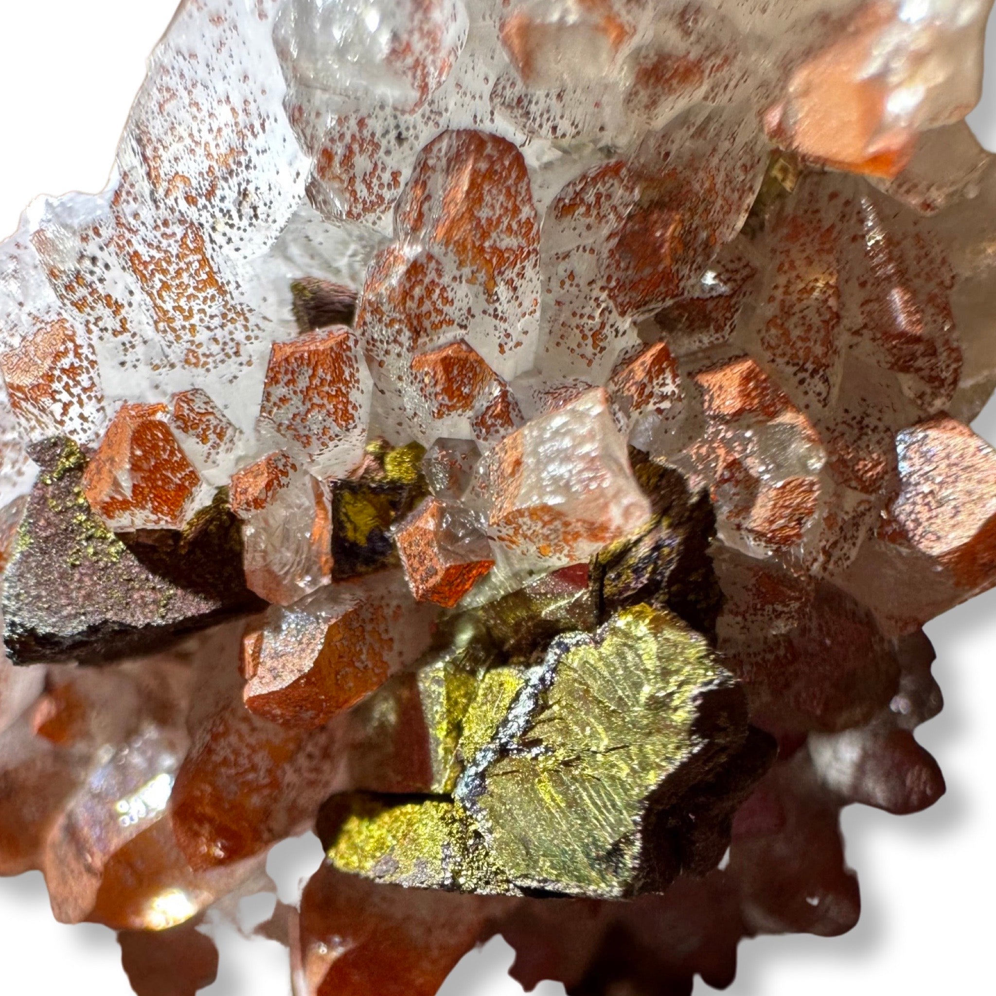 Aesthetic, etched quartz and calcite cluster, coated in sparkling golden pyrite.