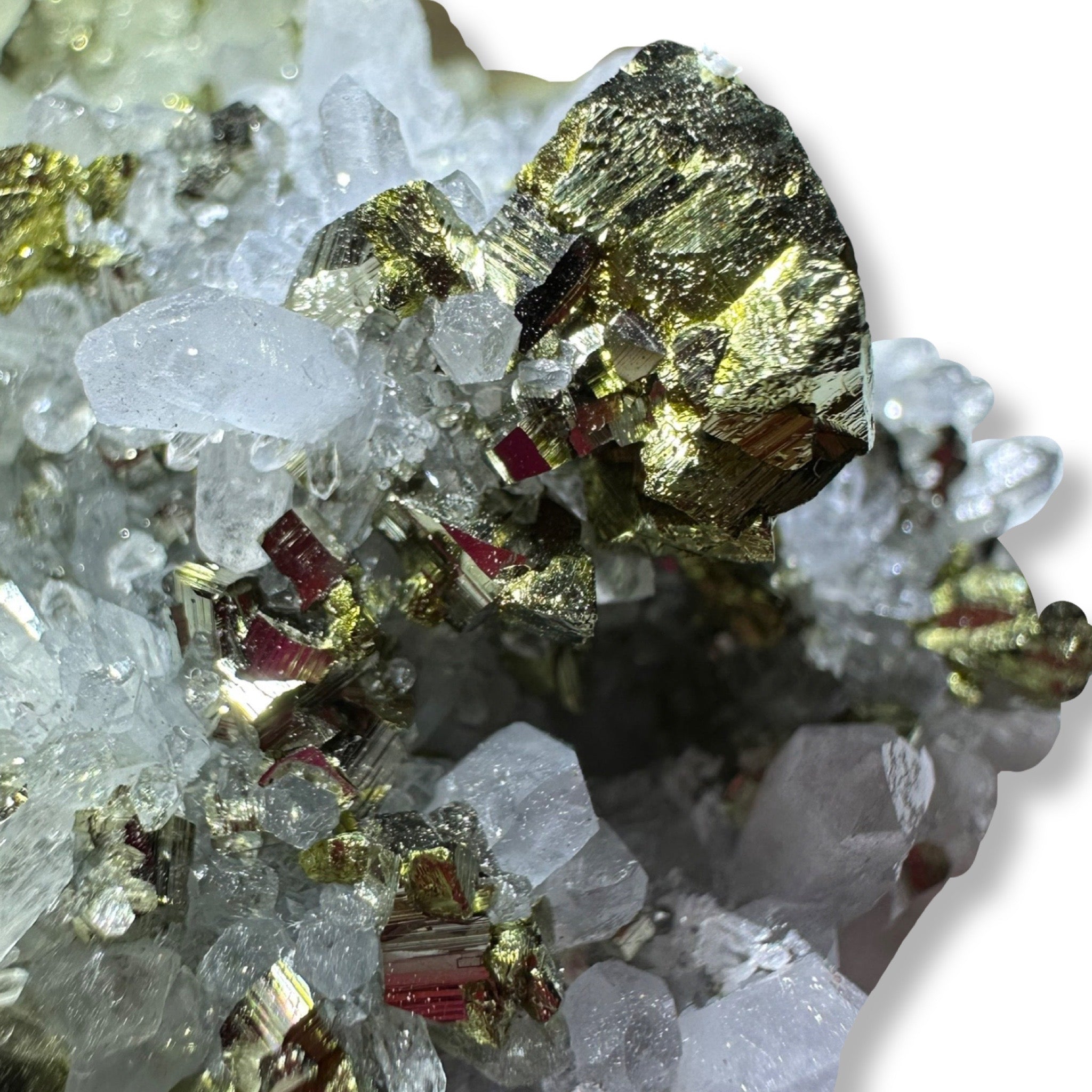 Aesthetic, etched quartz and calcite cluster, coated in sparkling golden pyrite.