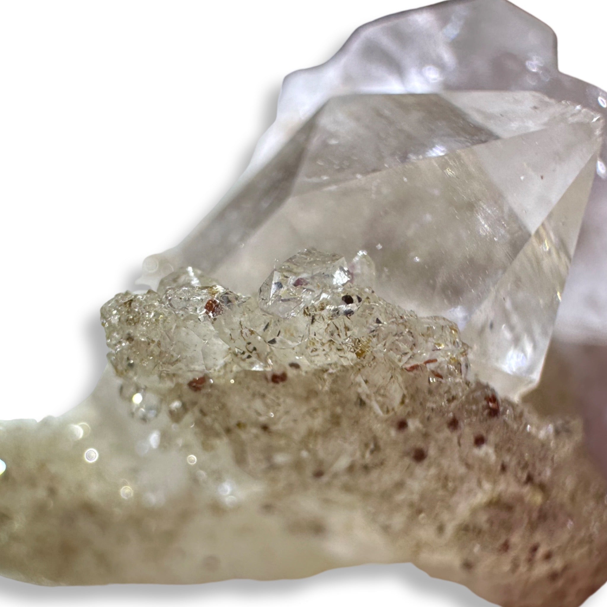 Aesthetic, etched quartz and calcite cluster, coated in sparkling golden pyrite.