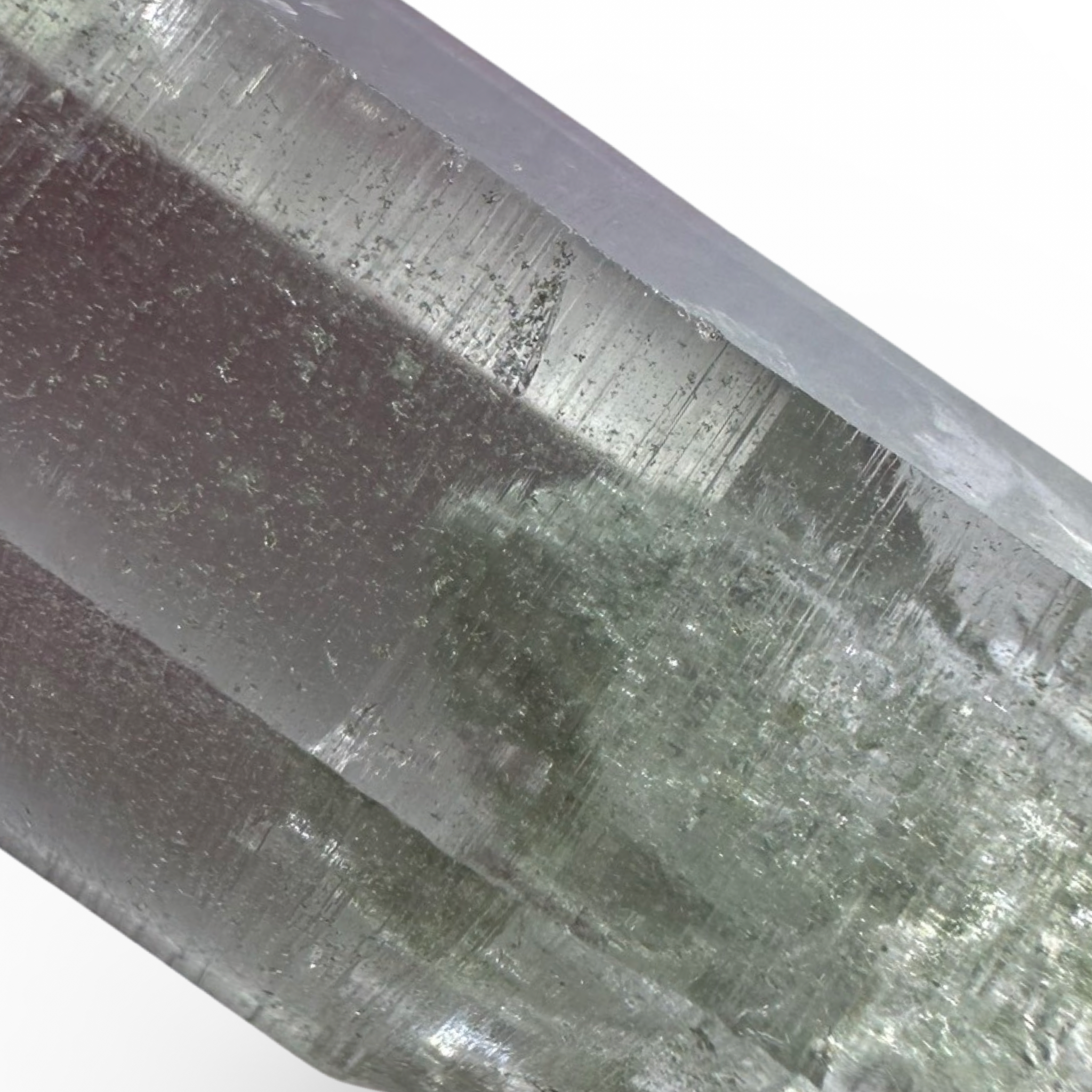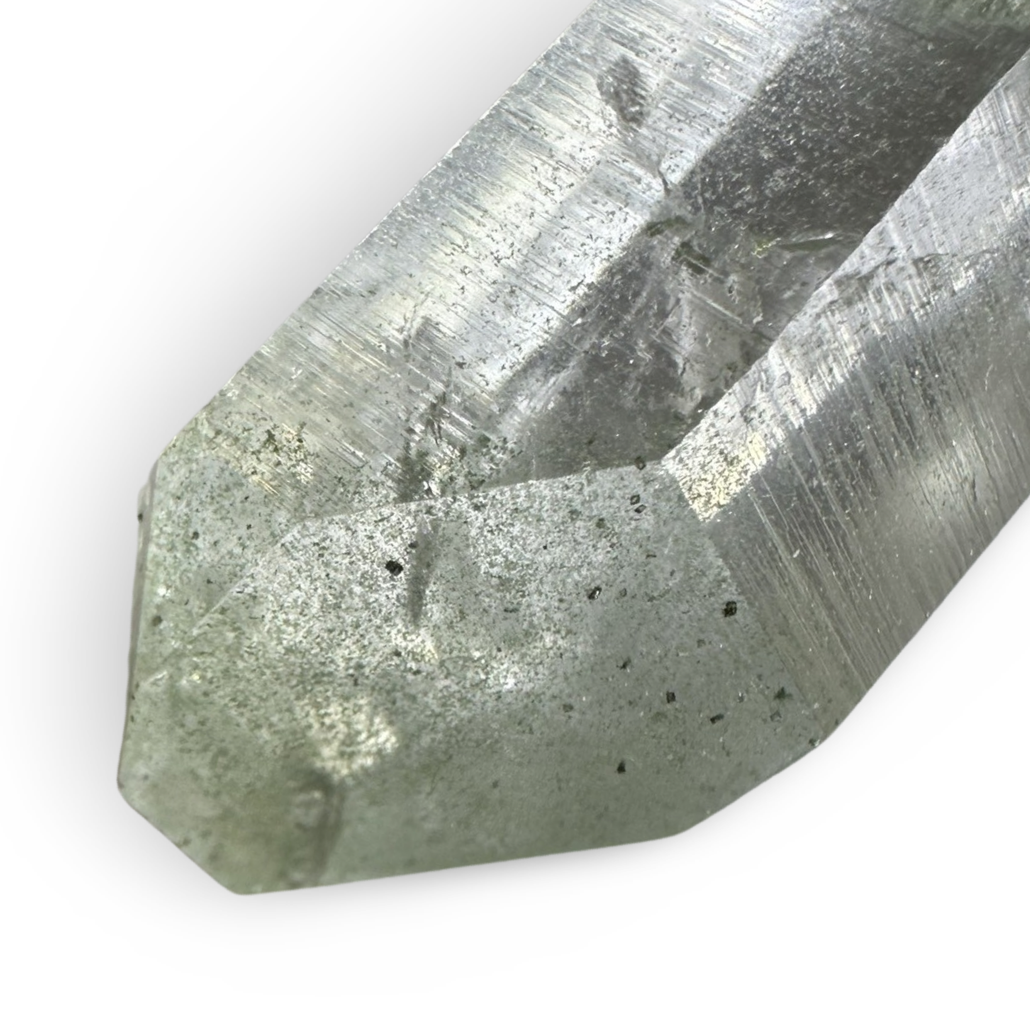 Chlorite Phantom Himalayan Samadhi Quartz can be found on the peaks of our planet. Known for having the strongest measurable vibration of a master crystal; this variety is less common than others. This type of quartz can sometimes including black tourmaline, rutile, anatase, and pyrite. Samadhi Quartz is said to bring clarity and balance to the heart and third eye chakras. A truly special crytsal with deep spiritual connections.