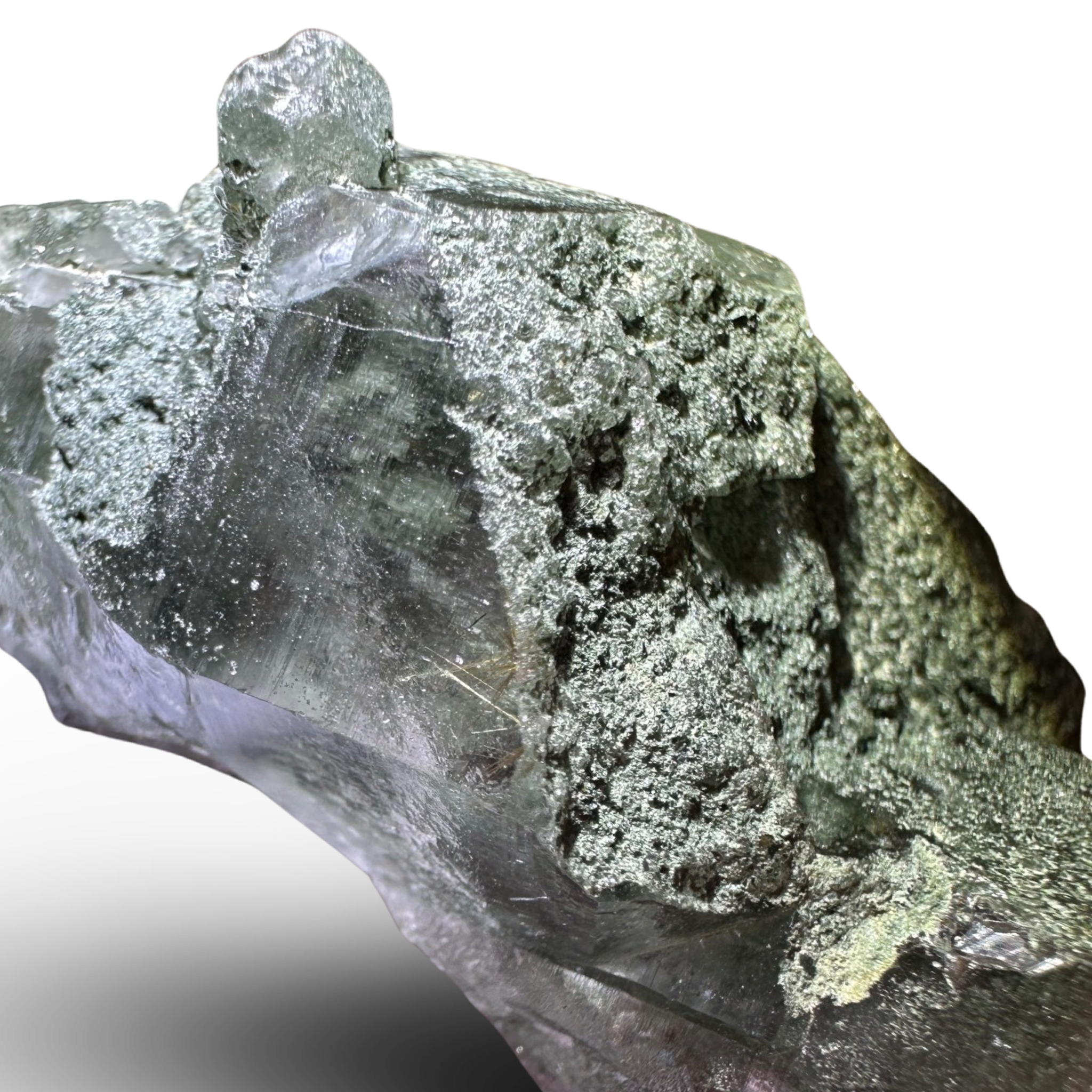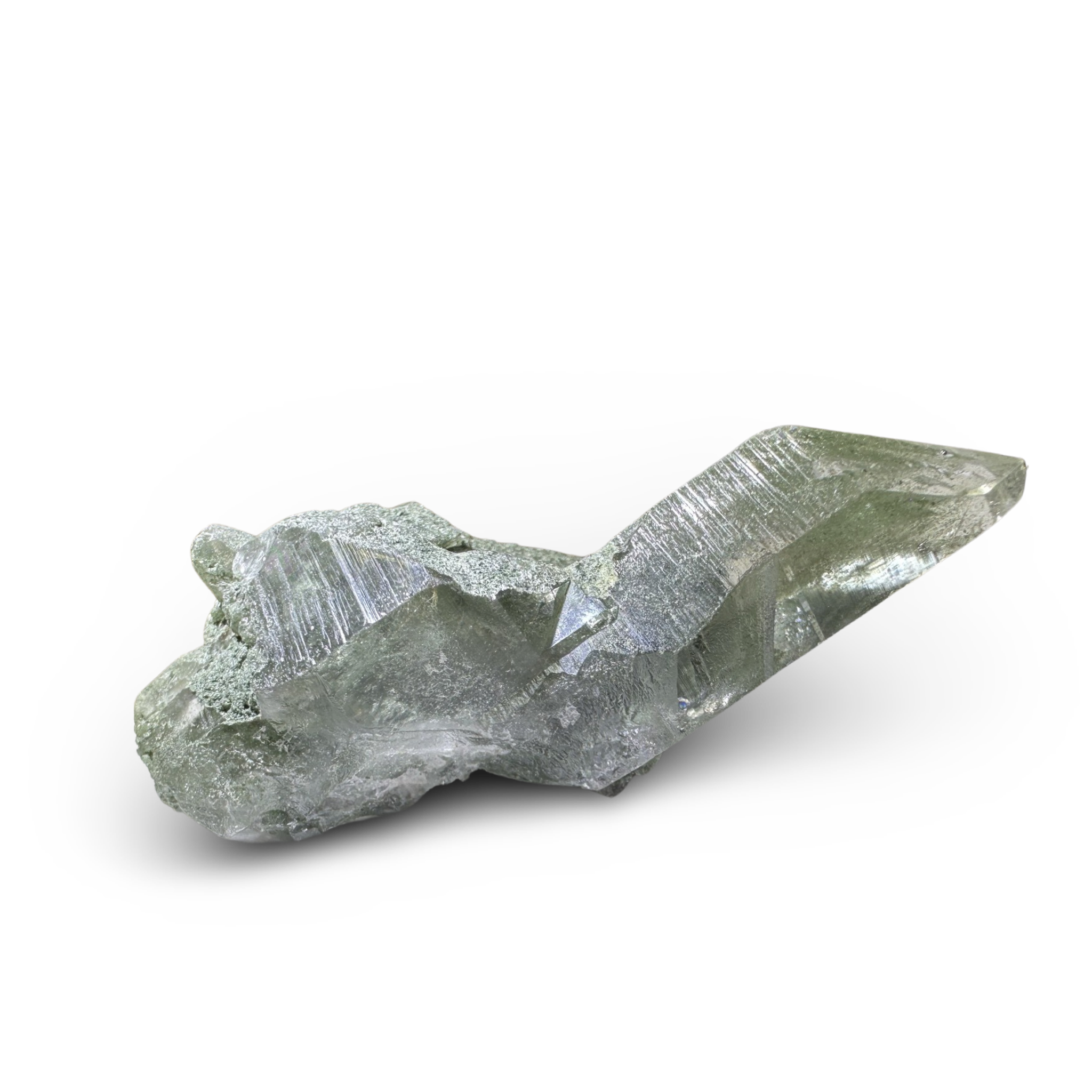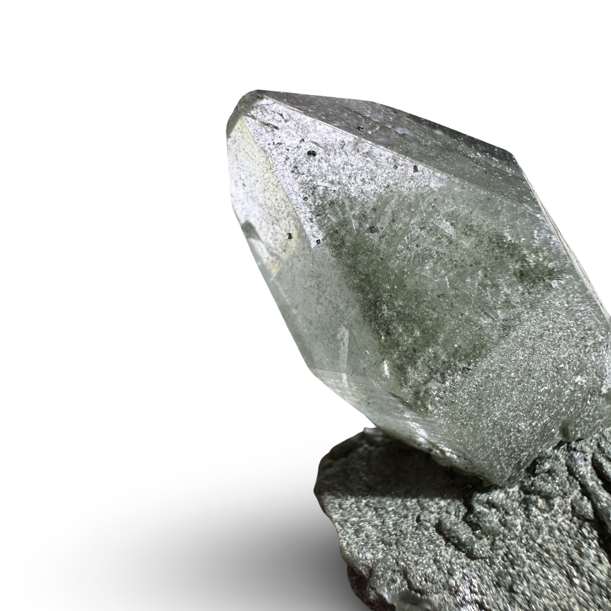 Chlorite Phantom Himalayan Samadhi Quartz can be found on the peaks of our planet. Known for having the strongest measurable vibration of a master crystal; this variety is less common than others. This type of quartz can sometimes including black tourmaline, rutile, anatase, and pyrite. Samadhi Quartz is said to bring clarity and balance to the heart and third eye chakras. A truly special crystal with deep spiritual connections.