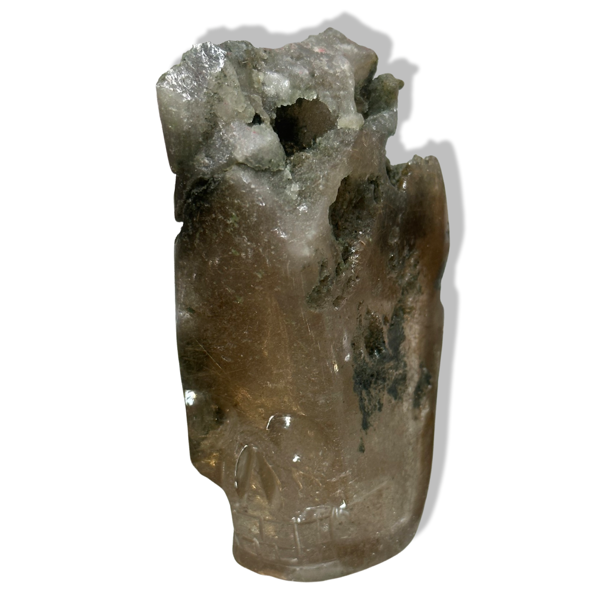 Skillfully carved and composed Himalayan Quartz skull by master carver, Subhash Meena. He selects the highest grade golden rutile and chlorite in Quartz from the peaks of the Himalayan mountains, painstakingly mined by hand and then carved in a way to preserve the nature of the stone.