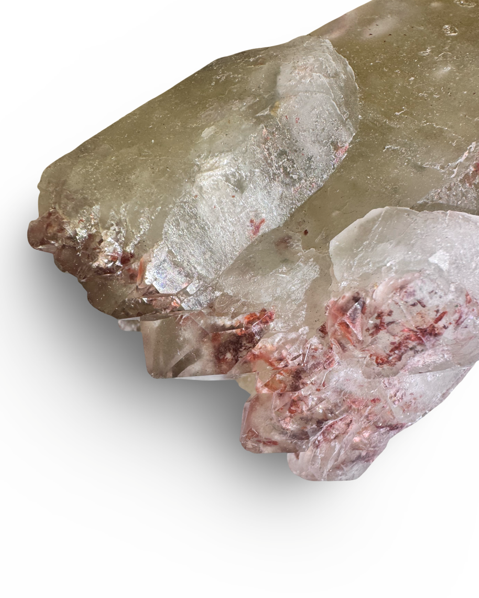 Rare phantom blood citrine lemurian seed. Rich in iron and hematite, some with elestial formations.