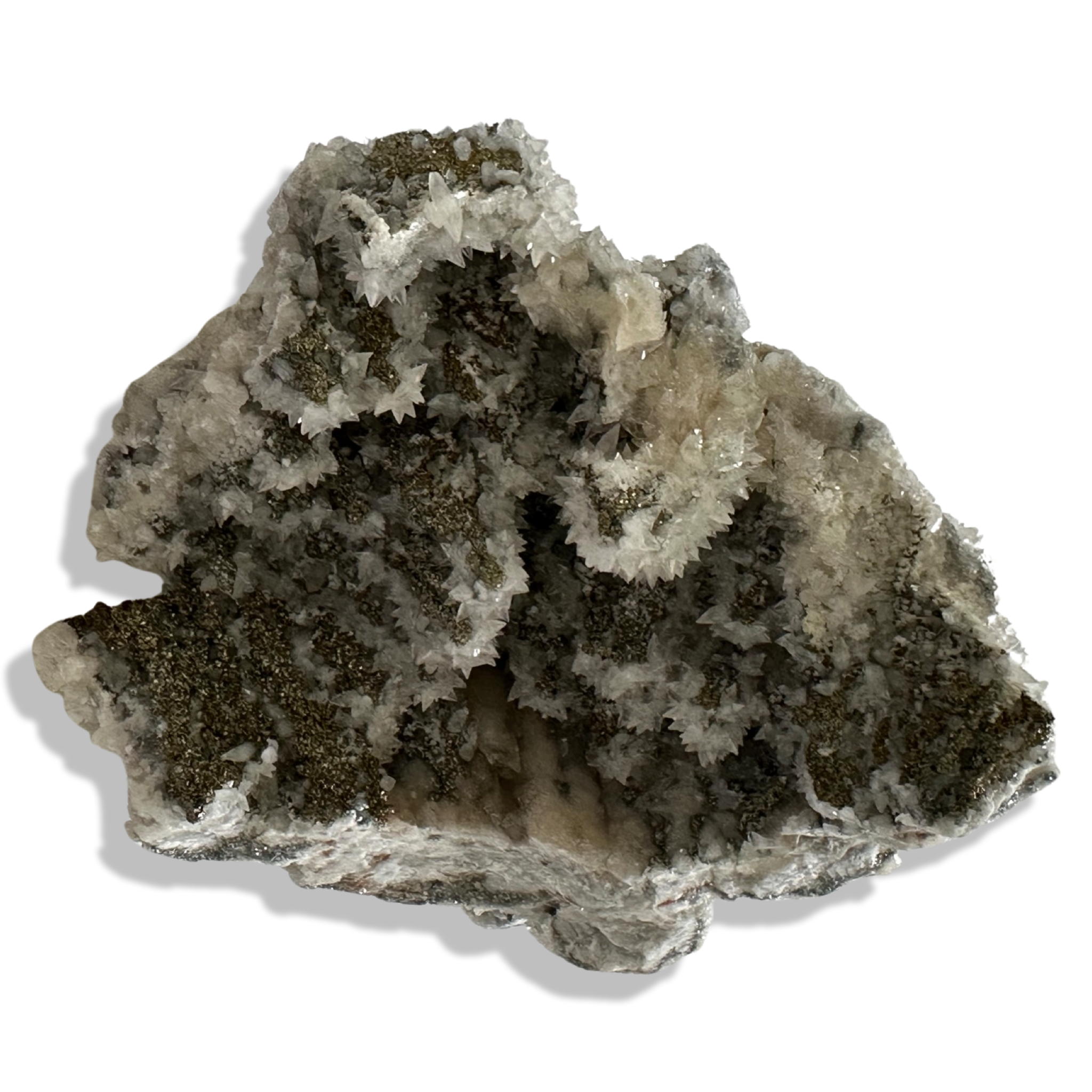 Extraordinarily sparkly, highly terminated, dog tooth calcite with pyrite on matrix, for grounding and calming.