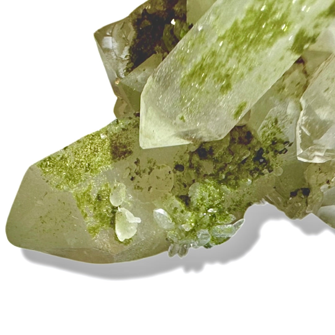 The pairing of Master Healer and clarity bringer, clear Quartz coupled with the powerful natural enhancer, Epidote will strengthen any emotions we may feel at that moment and bring clarity to them. We suggest placing this stone near when times are calm and keeping it at a distance during stressful times.